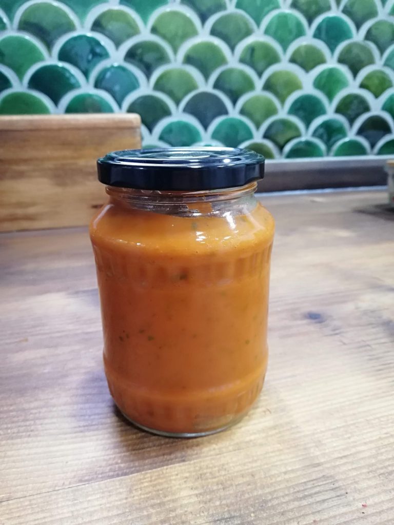 Ezután jön egy égetően veszélyes művelet: turmixolás még forrón. Vagy magas falú edényben botmixerrel, vagy kancsós mixer (én ezzel szoktam, mert ebből könnyen kiadagolható az üvegekbe), vagy akármilyen más masina, ami pürésít, és bírja a forróságot. DE! És itt jön a lényeg: a korábban leszedegedett bazsalikomlevelekből kb. 3-4 bő maroknyit, ami olyan 25-30 nagy levél lehet, a forró szószba teszem, és úgy mixelem össze, nem kell sajnálni, bőven mehet egészen simára. Ekkor kóstolok, mindig rakok még bele ízlés szerint sót és nádcukrot, utána újabb keverés. És ezután mehet az üvegekben, fejre fordítom, és 100 °C-on még betolom vissza a sütőbe 20 percre, majd ott is hagyom reggelig kihűlni.